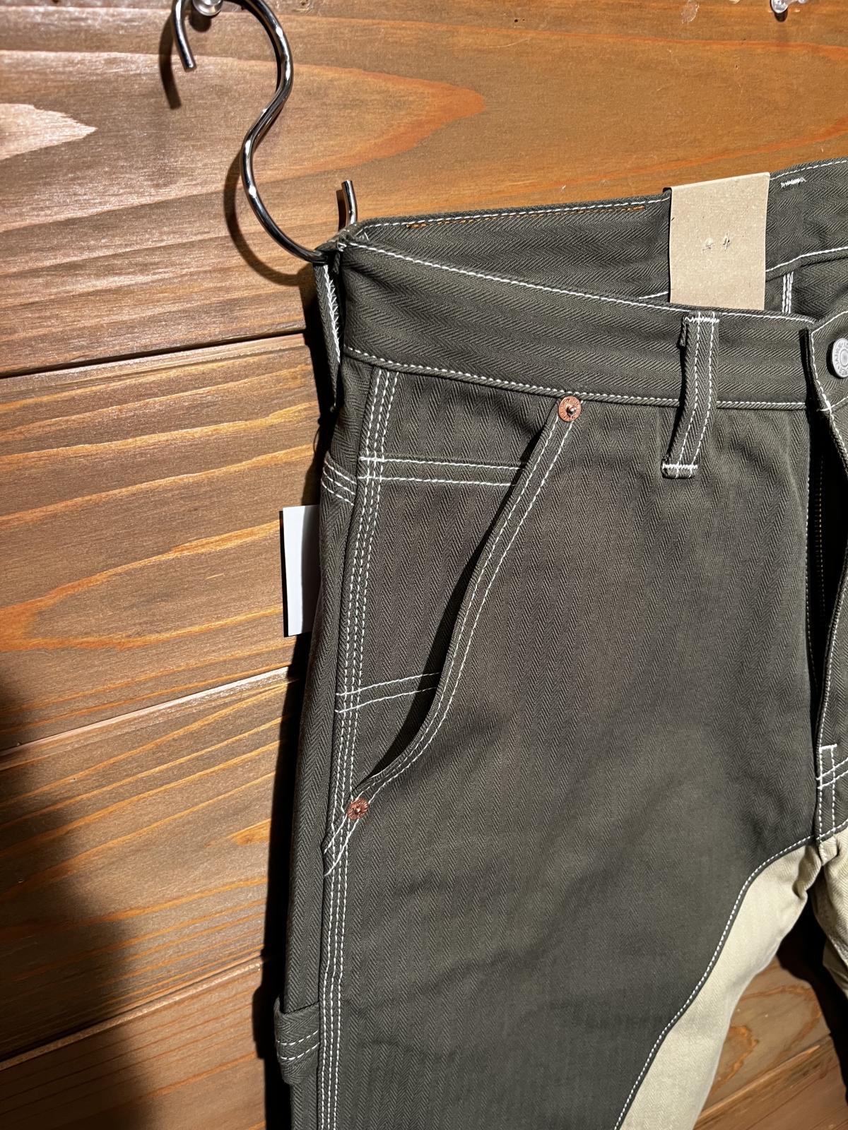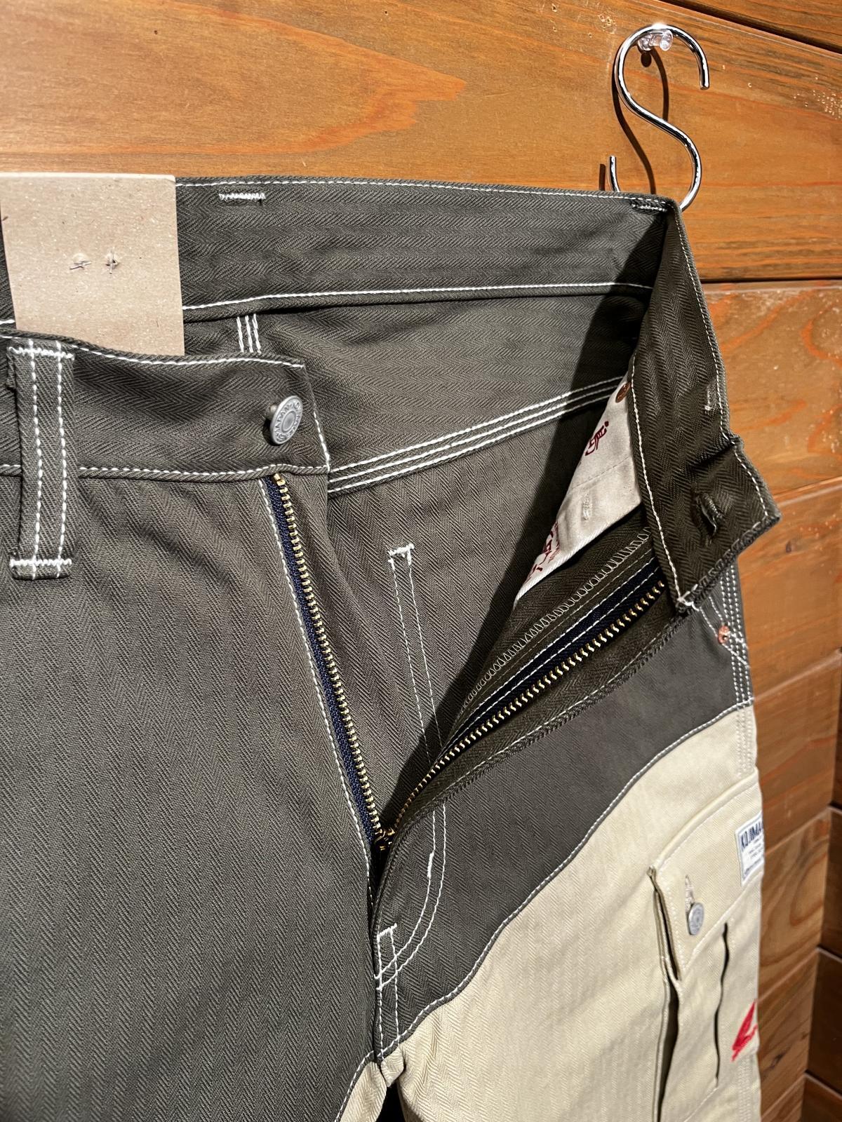 ミリタリーテイストを感じさせるカーキとベージュのヘリンボーンツイルと